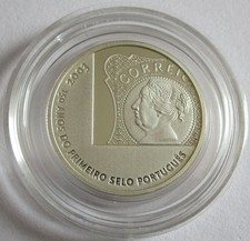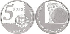 Portugal 5 Euro silver coin 150 years Portuguese stamps 2003 - in blister